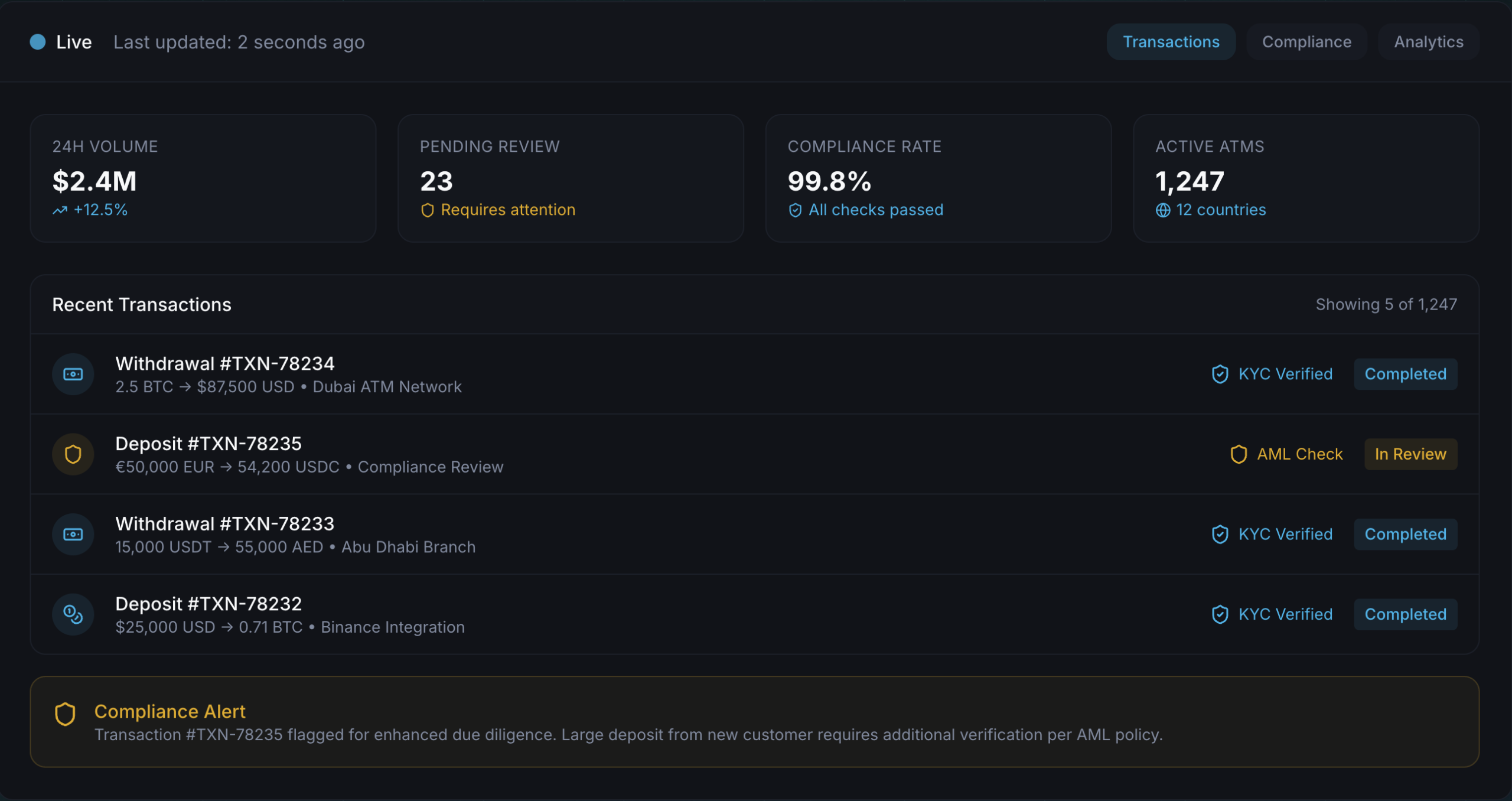 Launch new cash-crypto services to your customers. Monitor everything from our unified dashboard.